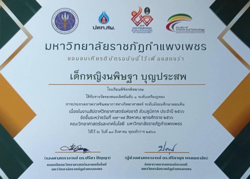 ขอแสดงความยินดี ด.ญ.นพิษฐา บุญประสบ ม.3/10 รองชนะเลิศอันดับ 1 แข่งขันวาดภาพสัปดาห์วันวิทยาศษสตร์แห่งชาติ