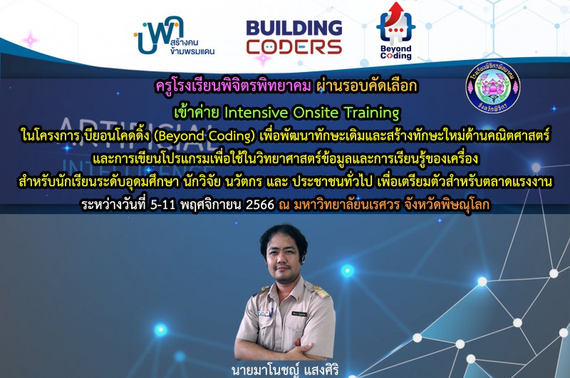 30 ตุลาคม 2566 ครูมาโนชญ์ แสงศิริ ครูโรงเรียนพิจิตรพิทยาคม ผ่านรอบคัดเลือก เข้าค่าย Intensive Onsite Training