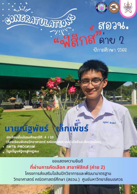 ขอแสดงความยินดี กับ นายณัฐพัชร์ เล็กเพชร นักเรียนชั้นมัธยมศึกษาปีที่ 4/10 (ห้องเรียนพิเศษวิทยาศาสตร์ คณิตศาสตร์ เทคโนโลยีและสิ่งแวดล้อม