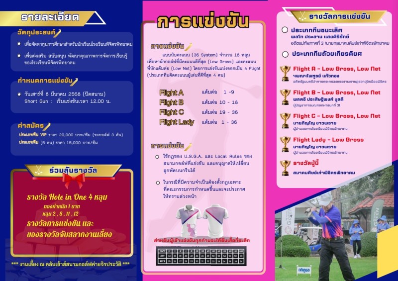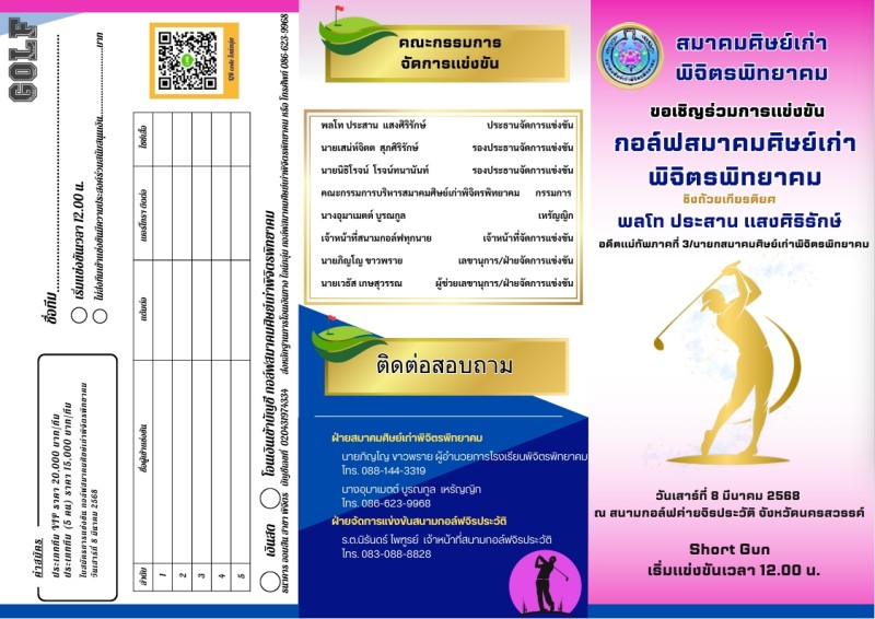 สอบถามรายละเอียดเพิ่มเติมได้ที่ 0-5661-1152 หรือ 087-199-8411 หรือสามารถโอนเงินสนับสนุน ส่งเสริมการศึกษาและช่วยเหลือนักเรียนโรงเรียนพิจิตรพิทยาคม ได้ที่ บัญชีธนาคารออมสิน สาขาพิจิตร บัญชีเลขที่ 020431974334 ชื่อบัญชี กอล์ฟสมาคมศิษย์เก่าพิจิตรพิทยาคม